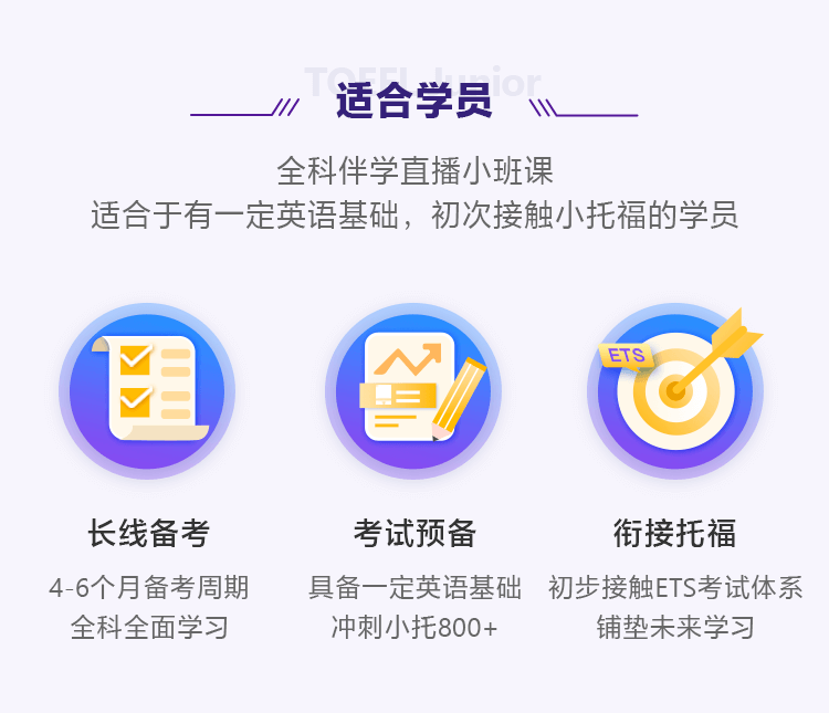课程时长:详情请电话咨询 针对初中生学习特点,量身定制TOEFL Junior学习计划。课程结合初中生背景知识匮乏、词汇量低、语法体系不清晰的特点,细致讲解词汇、背景知识、语法、笔记记法等基础内容,为冲刺TOEFL Junior做细致准备,也为后续学习TOEFL课程做好基础能力的铺垫。 |