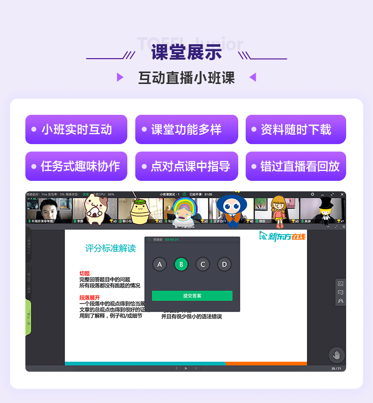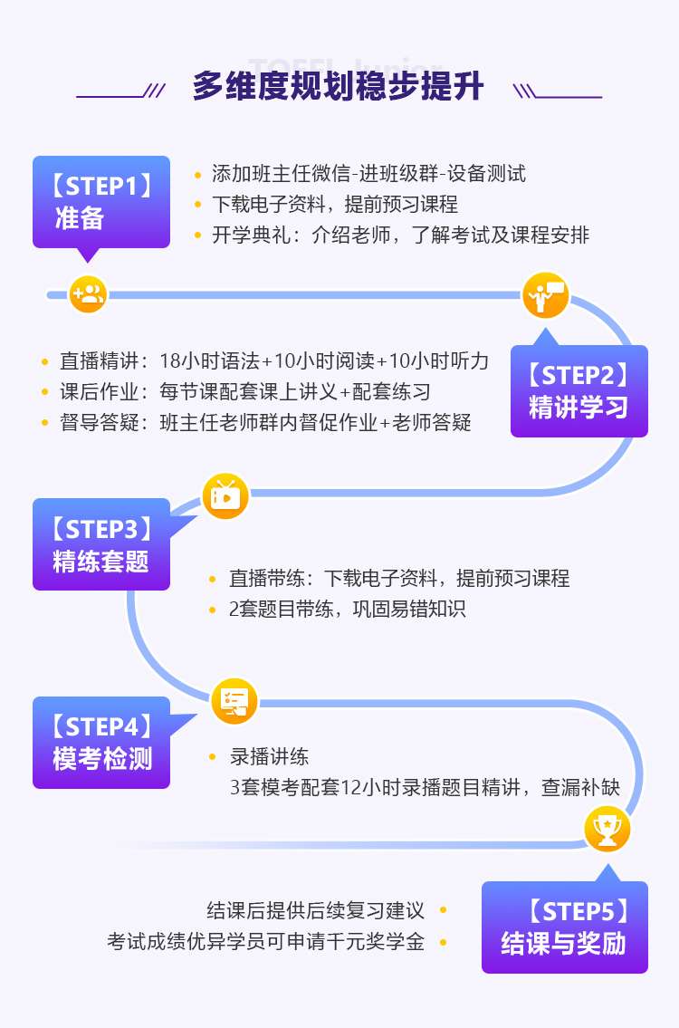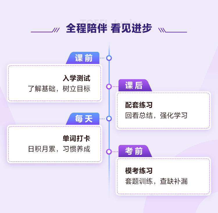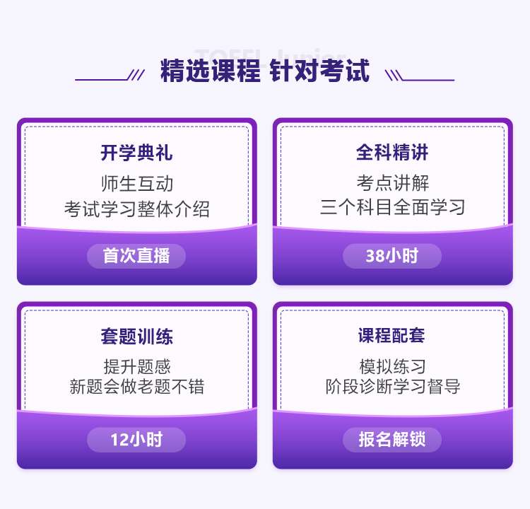 针对TOEFL Junior考试基础能力的提升课程,讲解听说读写基础语言知识,并涵盖语言形式及含义、阅读理解和听力理解三大部分的基础知识点及能力点,为备战TOEFL Junior考试打下坚实的语言和思维基础。帮助学生从基础段到题型段的过渡及衔接,培养学员取得TOEFL Junior考试高分所需要的能力。 |