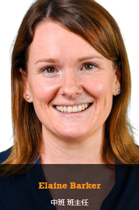 Elaine于2012年以优异成绩获得教育学学士学位后便开始其教师生涯。她曾在韩国首尔执教一年,后搬至上海,在一所幼儿园任教一年。随后返回英国攻读研究生课程,取得PGCE教师资格证并完成了新教师的见习期。在英国的儿童慈善组织工作一年后,Elaine决定返回上海,回到自己热爱的海外教学岗位。她遵循全人教育的理念,期望孩子获得全面发展,用自己老师教育他们的方式去启迪孩子。业余时间,Elaine喜欢打羽毛球,参与各类活动。